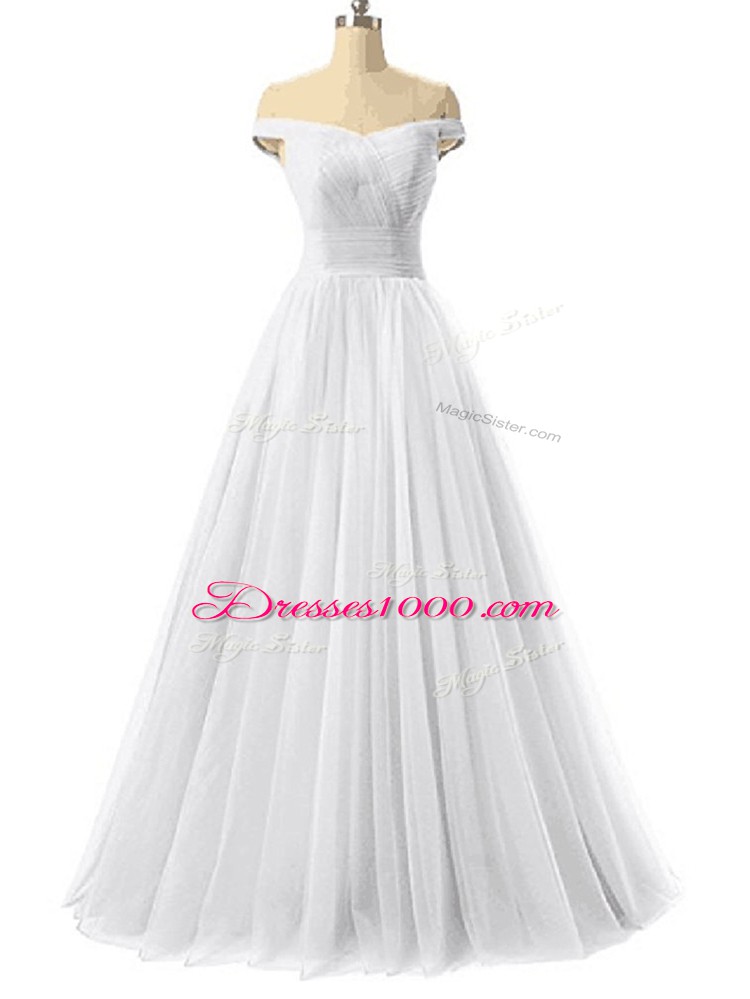 Traditional White Sleeveless Floor Length Ruching Lace Up Formal Evening Gowns