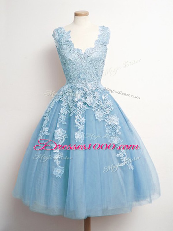 Knee Length Light Blue Quinceanera Court of Honor Dress V-neck Sleeveless Lace Up