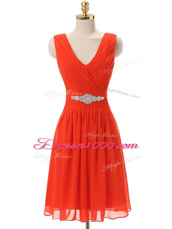 Sleeveless Knee Length Beading and Ruching Zipper Prom Dresses with Red
