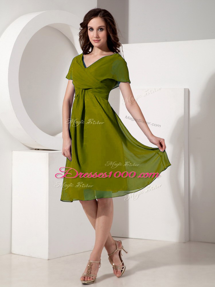 Exceptional Olive Green Chiffon Zipper Mother of Bride Dresses Short Sleeves Knee Length Ruching