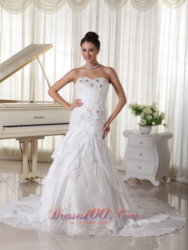 Your wedding gown should be the focal point of the event and all eyes will definitely be on you in this stunning dress. It features beautiful embroidered and beaded floral appliques throughout the bodice and the skirt. Its strapless bodice is encrusted with a wide wraping ruching and a beautiful A-line skirt with layers of fabric that extends into a sweep train in the back. Delicated flowers decorates the dress, giving the dress a charm look. Don't be hesitate, this dress will be the right one for your choice.