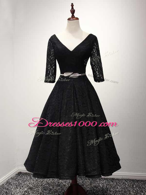 Black A-line V-neck Half Sleeves Lace Ankle Length Lace Up Lace and Belt Evening Dress