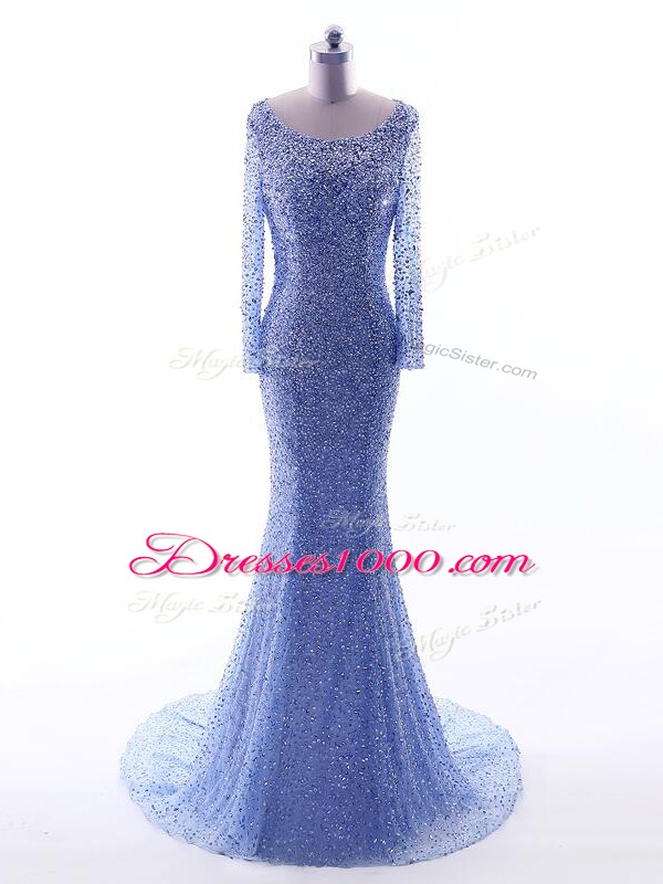 Dynamic Blue Evening Gowns Tulle Brush Train Long Sleeves Sequins