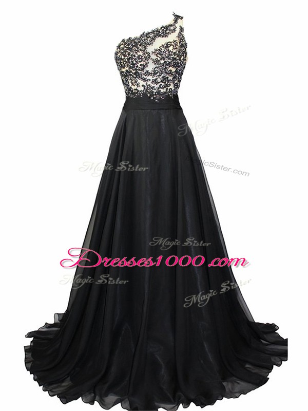 Black Chiffon Side Zipper Evening Gowns Sleeveless Brush Train Beading and Lace