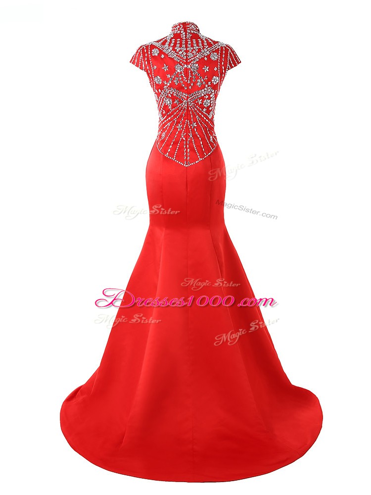 Short Sleeves Satin Sweep Train Zipper Prom Dresses in Coral Red with Beading