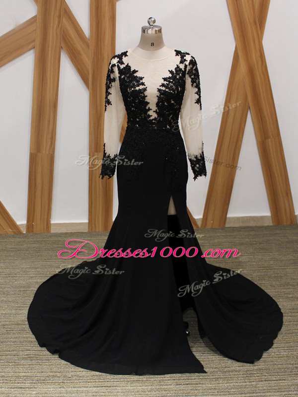 Stylish Black Mother of Groom Dress Scoop Long Sleeves Brush Train Zipper