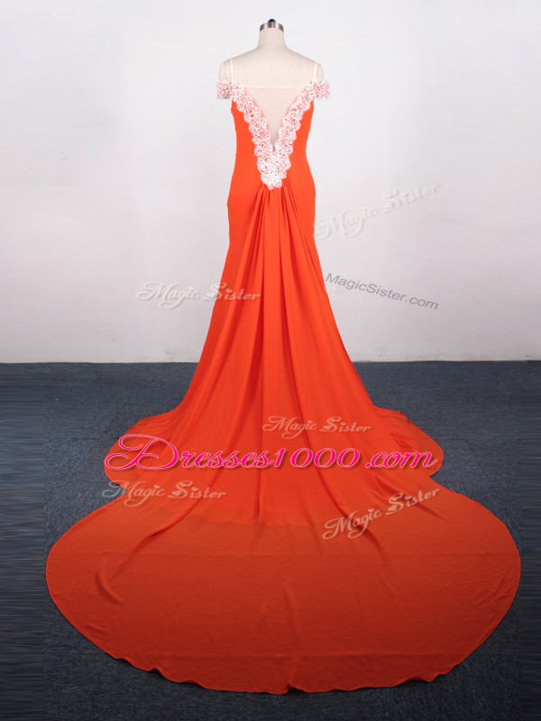 Smart Orange Red Womens Evening Dresses Prom and Party and Military Ball and Sweet 16 with Lace and Appliques Straps Sleeveless Watteau Train Side Zipper