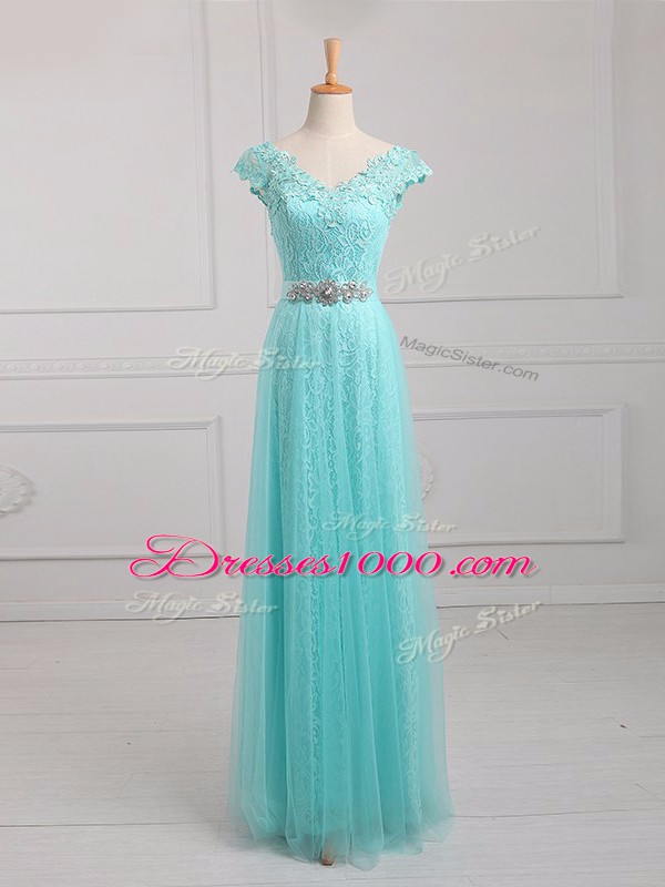 V-neck Cap Sleeves Tulle and Lace Mother of the Bride Dress Beading and Appliques Lace Up