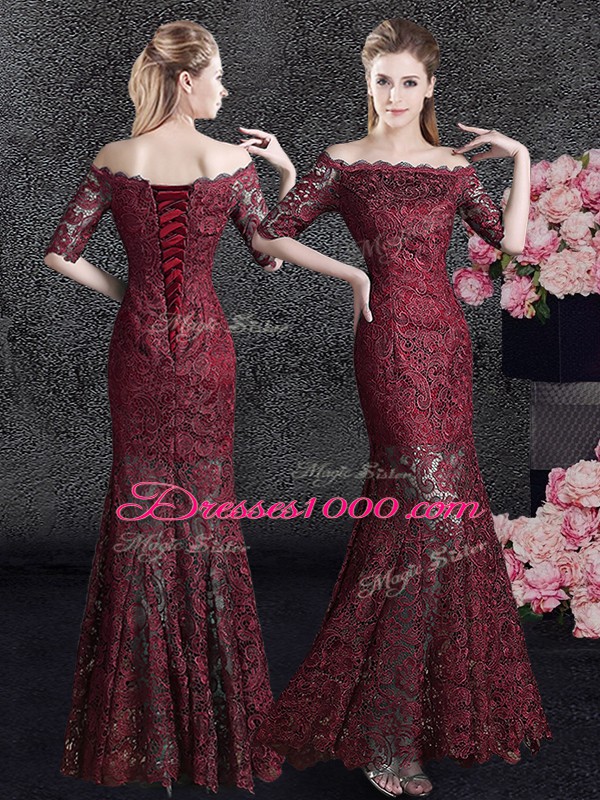 New Style Mermaid Wine Red Off The Shoulder Lace Up Lace Mother of Bride Dresses Half Sleeves