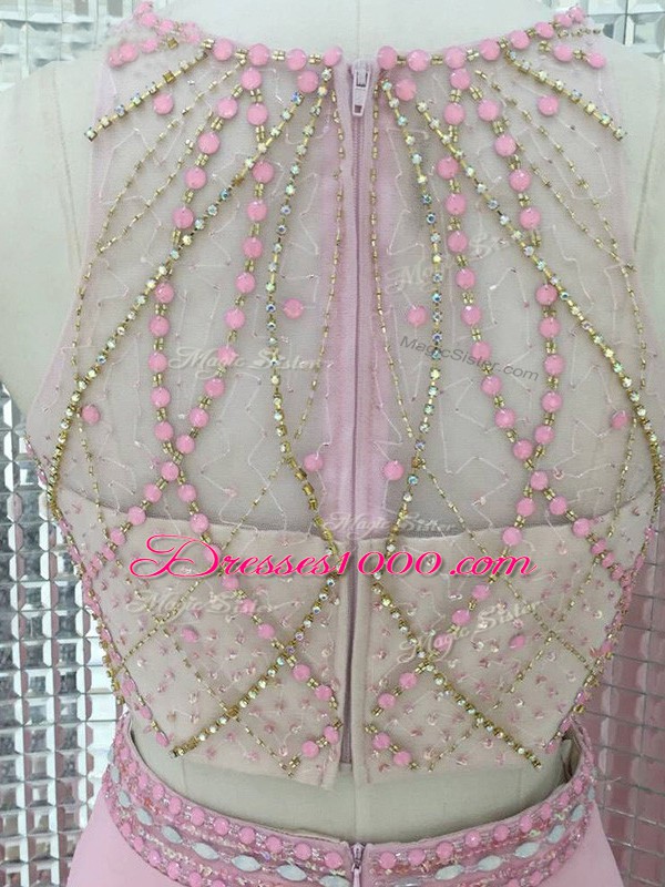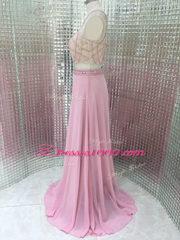 Superior Chiffon Sleeveless Brush Train Zipper Beading Evening Gowns in Pink