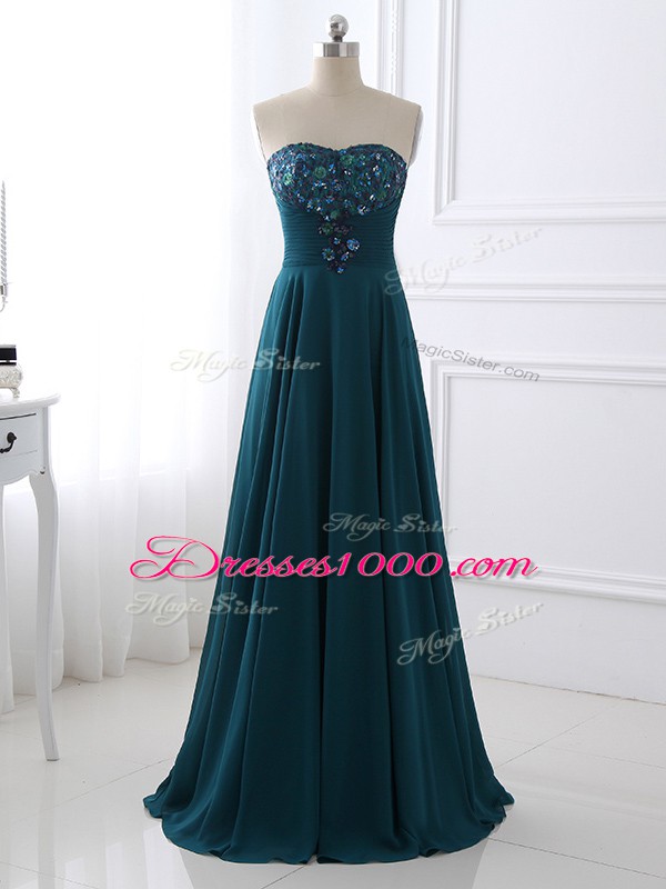 Discount Teal Chiffon Zipper Sweetheart Sleeveless Floor Length Mother of the Bride Dress Sequins and Ruching