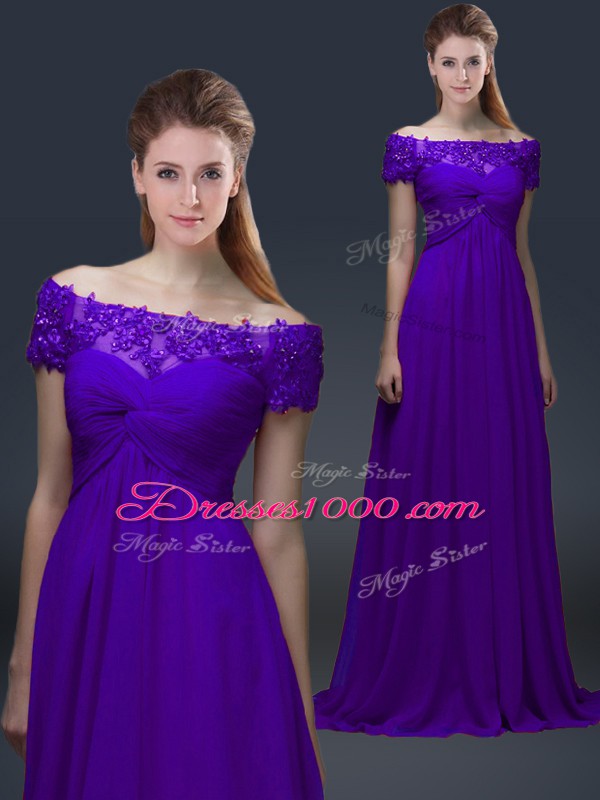 Popular Purple Off The Shoulder Neckline Appliques Mother of the Bride Dress Short Sleeves Lace Up