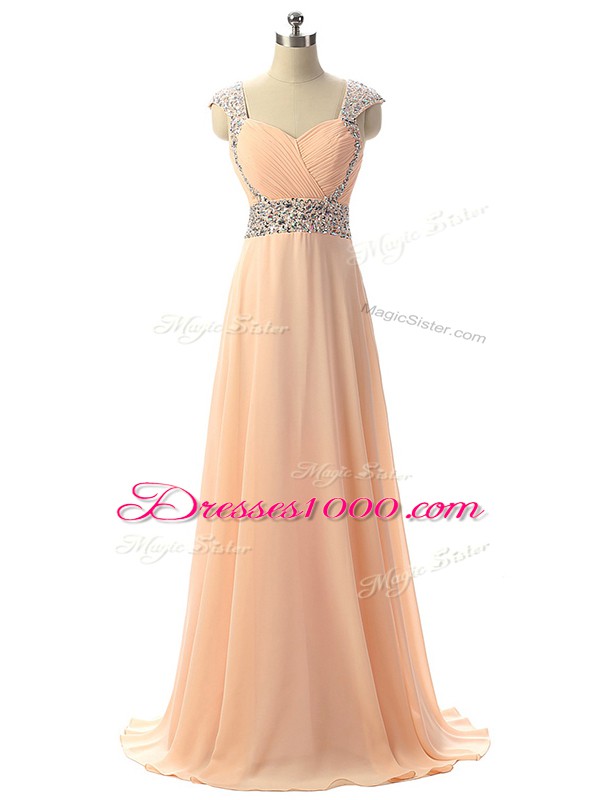 Top Selling Peach Chiffon Lace Up Prom Dress Cap Sleeves Floor Length Beading