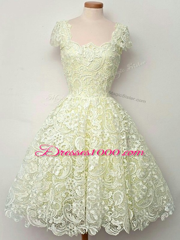 Cap Sleeves Knee Length Lace Lace Up Dama Dress for Quinceanera with Yellow