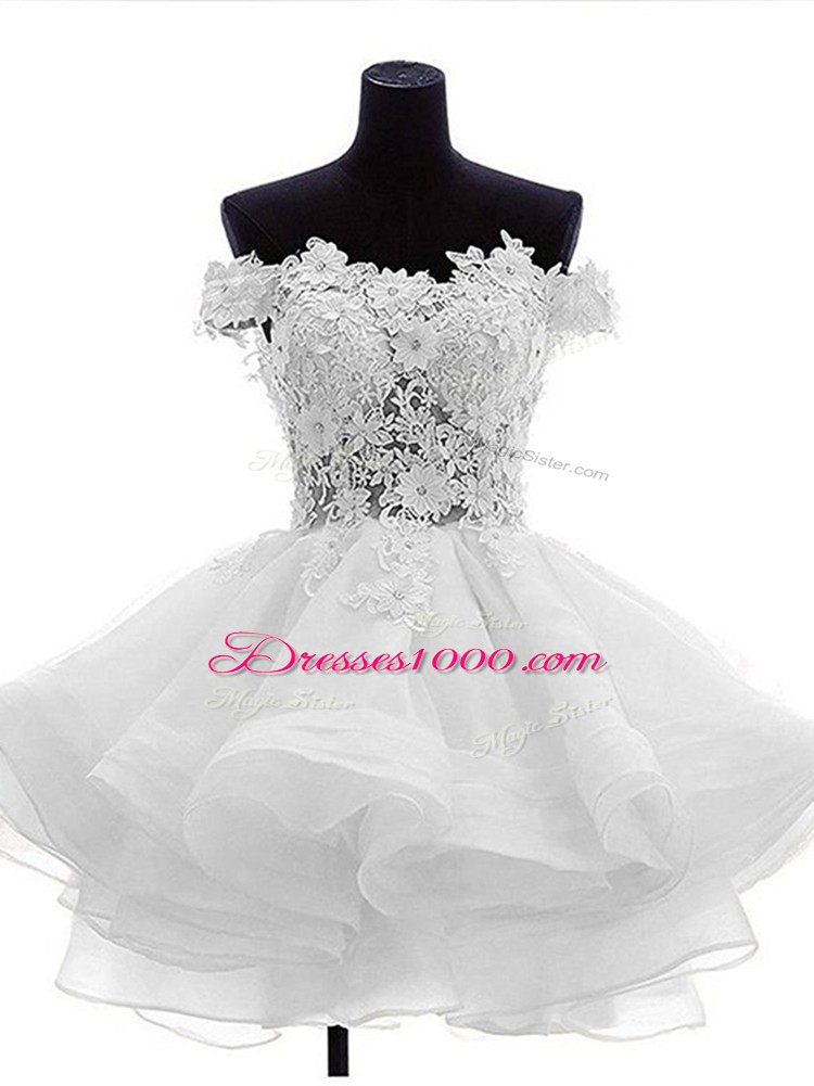 Fabulous Off The Shoulder Sleeveless Party Dress for Girls Mini Length Beading and Lace and Ruffles White Organza