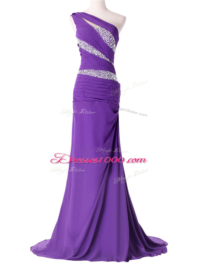 Captivating Brush Train Column/Sheath Prom Evening Gown Purple One Shoulder Chiffon Sleeveless Lace Up