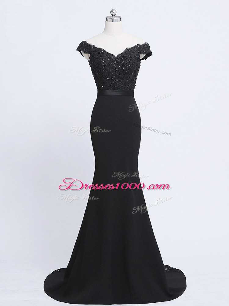 Artistic Black Zipper Formal Dresses Lace and Appliques and Belt Sleeveless Brush Train