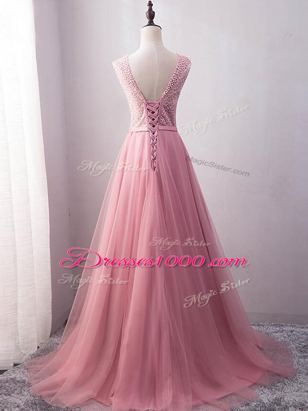 Pink Empire Beading and Belt Evening Dress Lace Up Tulle Sleeveless