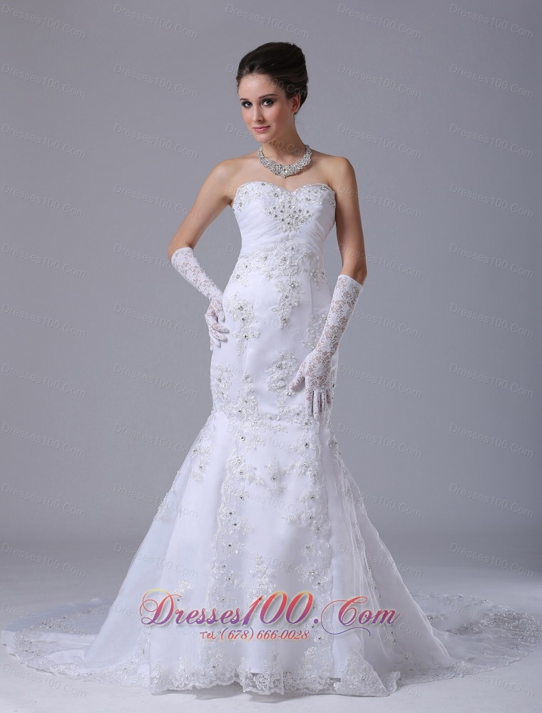 This long wedding dress is simple and fashionable. A strapless dress in comfortable lace is hard to find, but this amazing long strapless is at a price you can afford. Sweet heart neckline and ruched bodice add sexuality and elegance to this mermaid style. Appliques cover the bust area and the whole dress. The court train and the lace up back finishes the white wedding dress. If you want to be the spotlight, you will never miss this perfect gown.