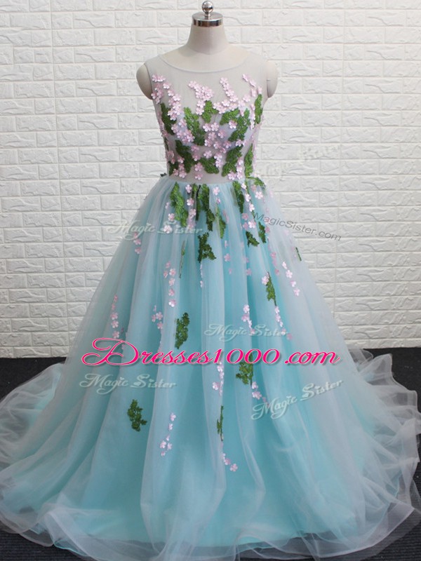 Tulle Sleeveless Pageant Dress for Teens Brush Train and Appliques