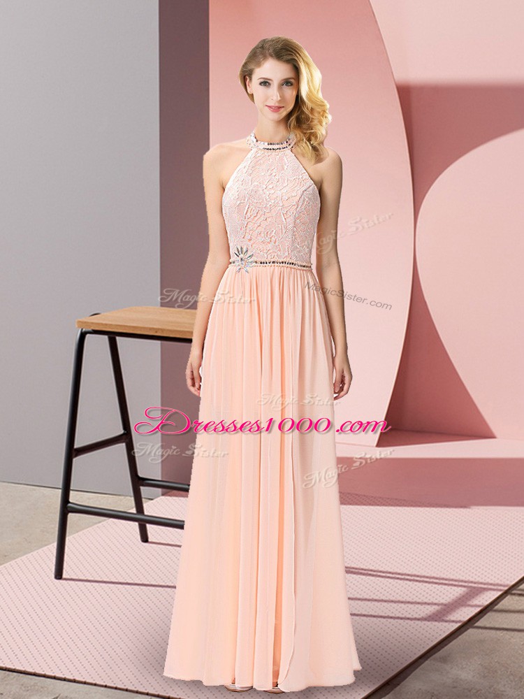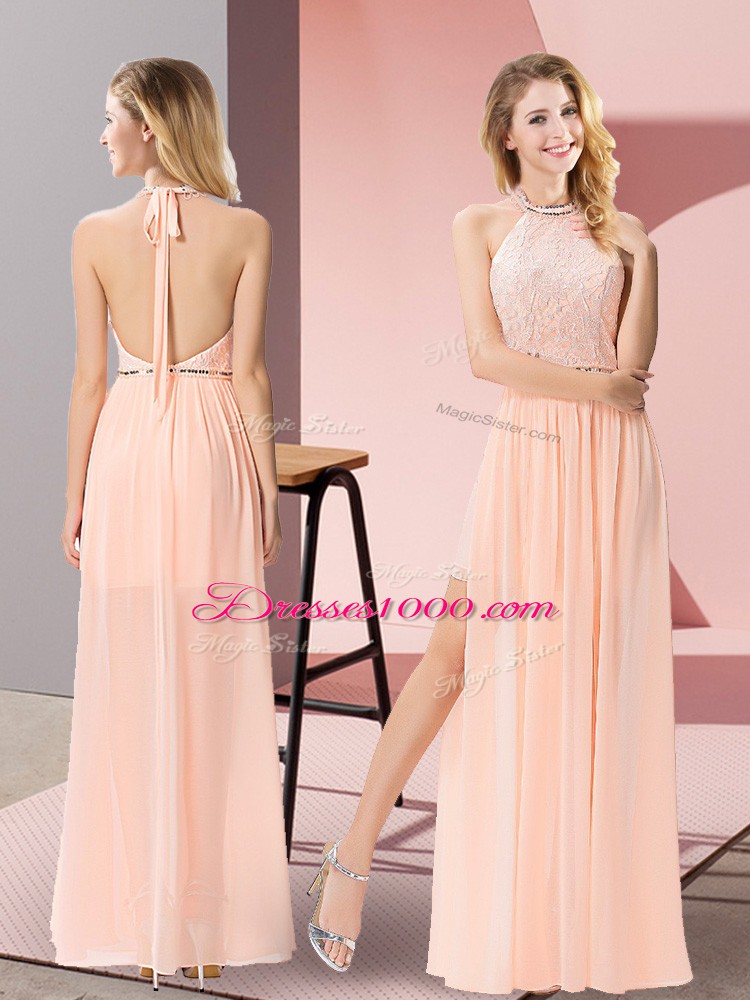 Column/Sheath Junior Homecoming Dress Peach Halter Top Chiffon Sleeveless Floor Length Backless