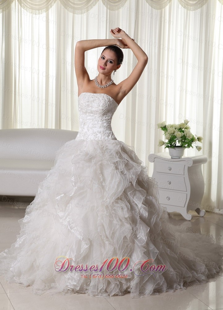 Look like a dream walking down the aisle in this fluttering wedding dress. This gown is strapless with a structured bust and bodice. Fine embroidery and beads sit at a diagonal at the bodice. The skirt has layers of soft ruffles for an angelic effect as you walk across the room. The skirt is full and has an exaggerated A-line shape. This is ideal for the bride who wants a classic look with dramatic details.