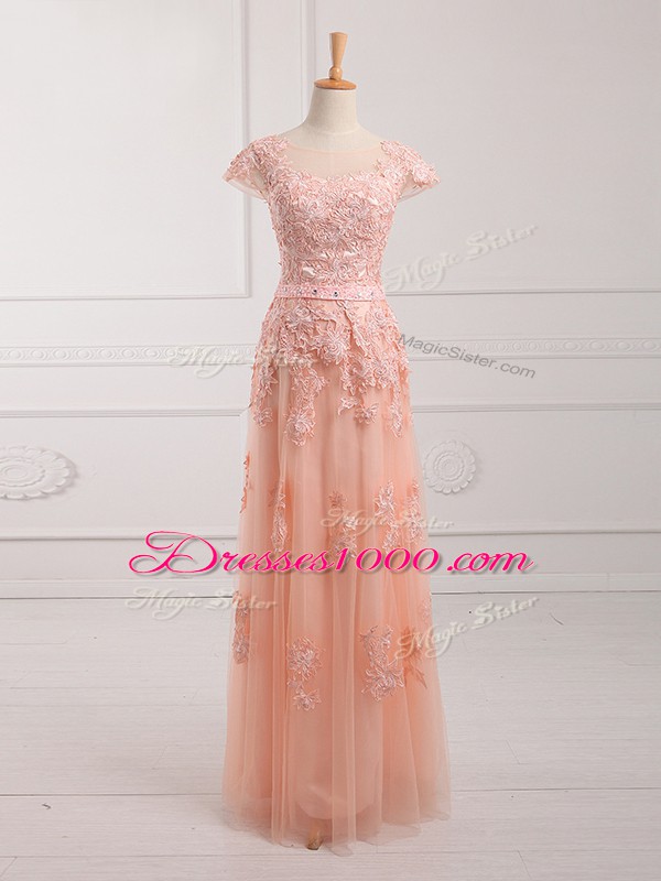 Flare Scoop Cap Sleeves Mother of Bride Dresses Floor Length Lace and Appliques and Belt Peach Tulle