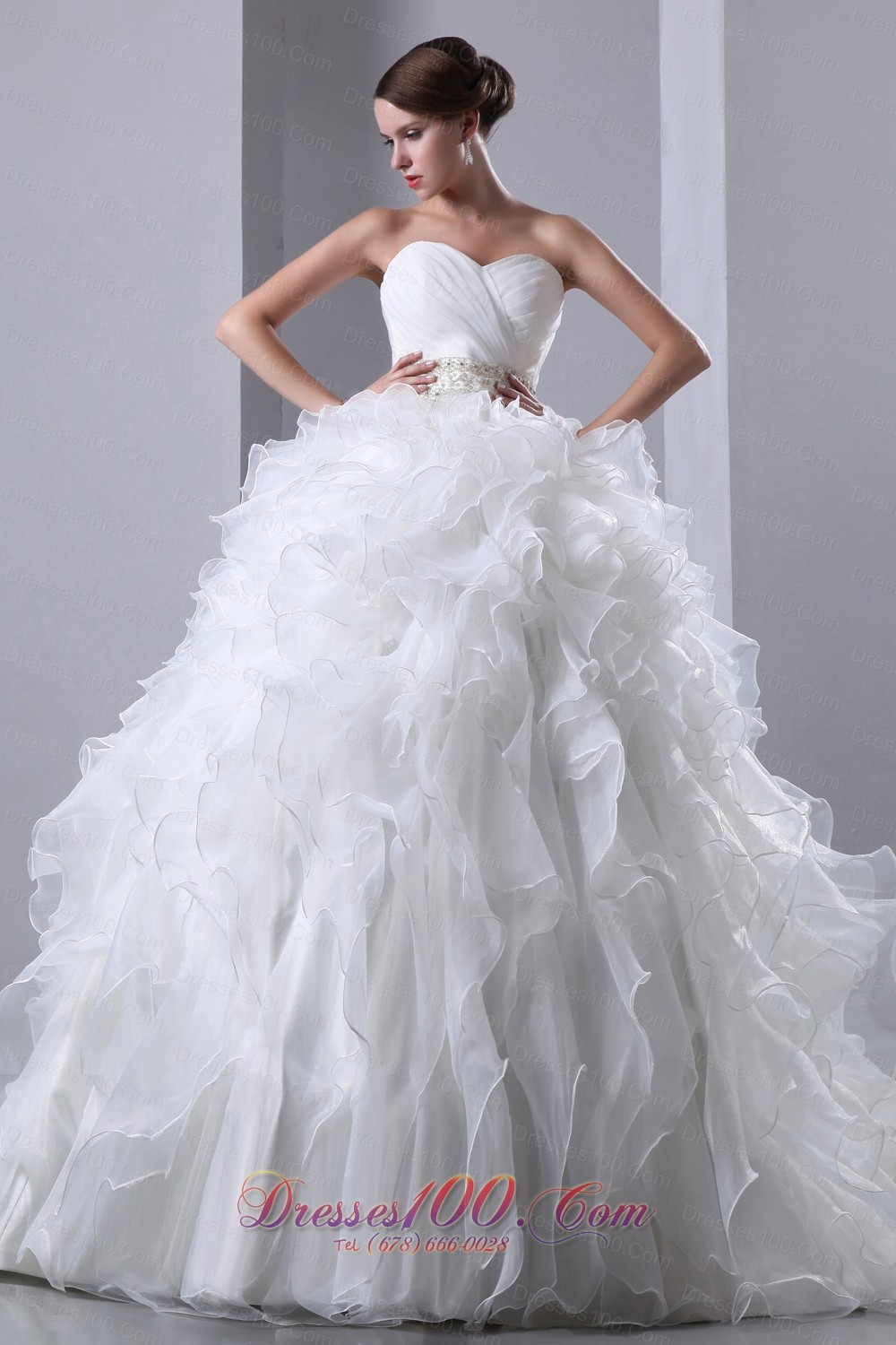 This dramatic wedding dress featured with its ball gown silhouette and the embroidery bodice has an air of mystery about it. Flower-shaped ruffles on the romantic skirt make the beauty of the dress vivid.Corset closure can outline your slim figure especially your charming waist. Simple but fashion design is suitable at wedding.