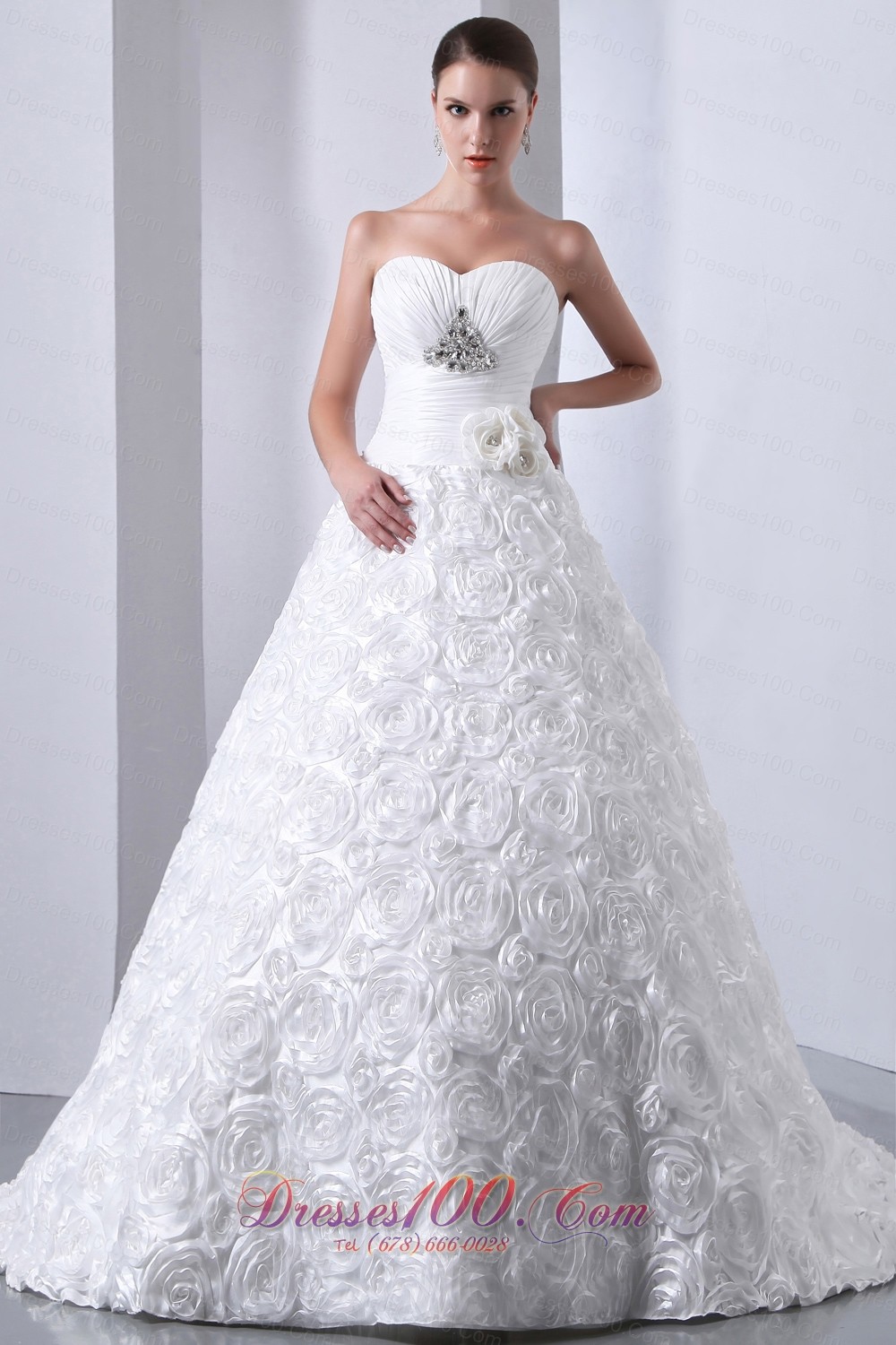 Look like you just stepped out of the pages of a bridal magazine in this gorgeous wedding gown. It features a strapless and heavily ruched bodice with sweetheart neckline. The A-line skirt is totally covered with numerous rolling flowers that create a stunning silhouette when worn. A sweeping train with rounded hem and superb fabric covered button closure complete this gorgeous bridal design.