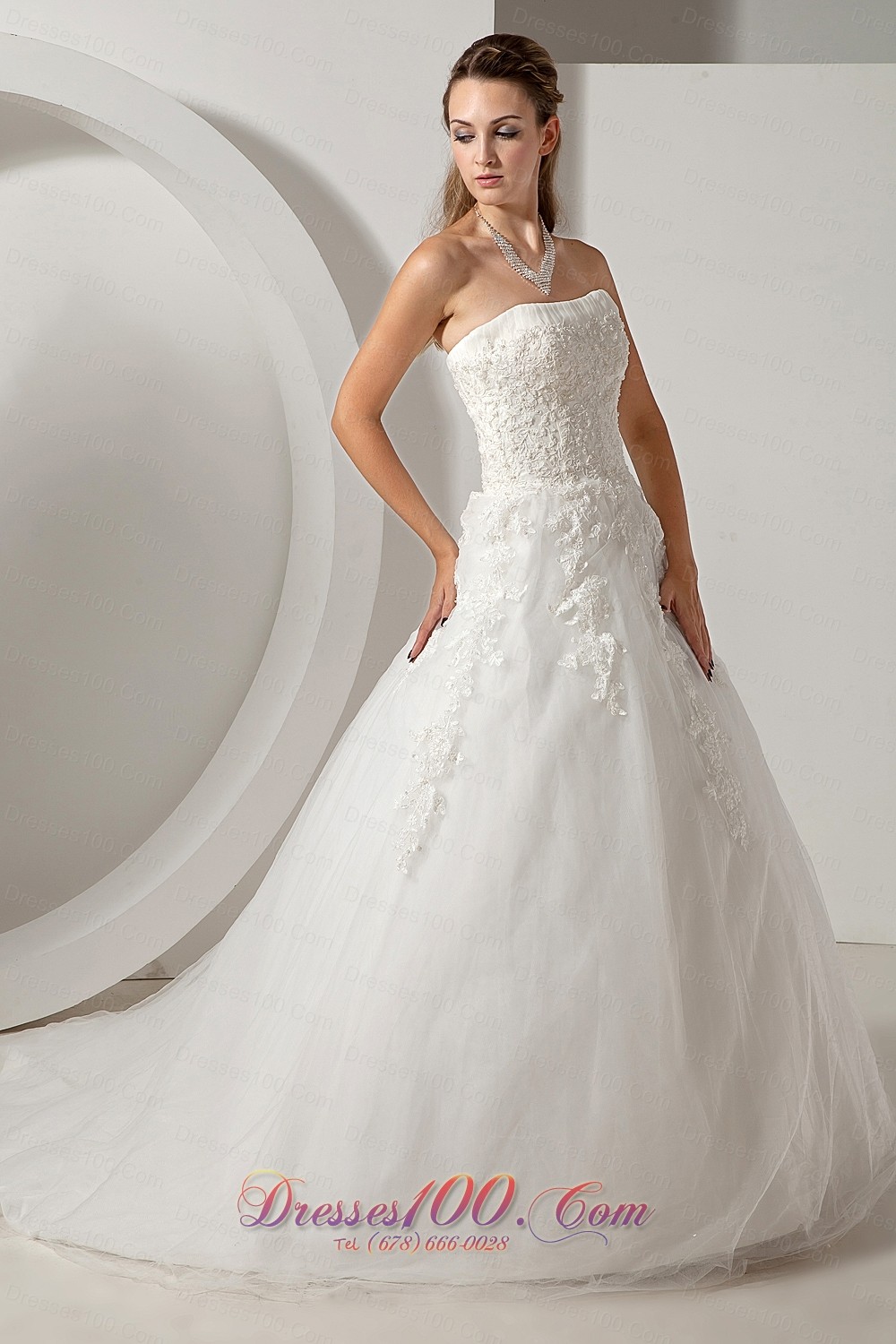 You`re sure to be on cloud nine when you check yourself out in this fanciful creation! The strapless bodice is highlighted by bulky handcrafted lace embellishments contouring your slim figure and charming curve. Its midriff is eye-catching for the ribbons of lacy appliques. The skirt puffs in solid tiers topped with airy, sheer icing layers of graduated lengths.