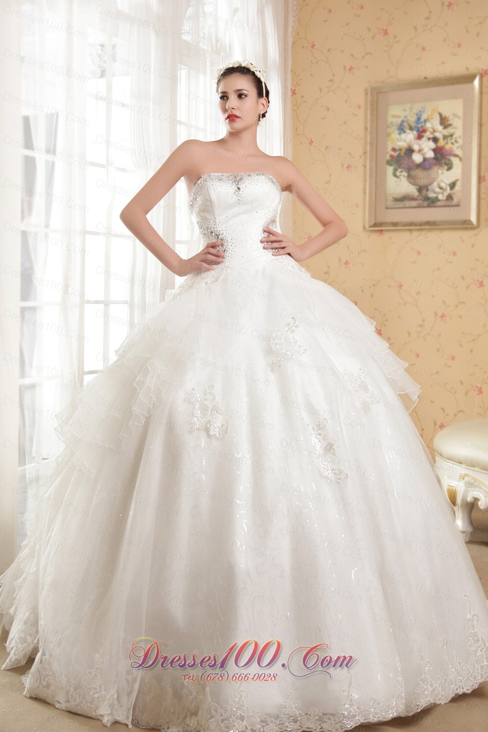 This unparalleled white wedding dress definitely captures your eyes! The structured bodice is overflowed with shinning beading formed a refined vase and a modest sweetheart. The A-line skirt with a chapel train is overlayed with sheer tulle that adds to its overal fullness and the underskirt made of exquisite lace embellished with appliques. The back features the trim of the corset style closure. Such a gorgeous creation, why not capture it?