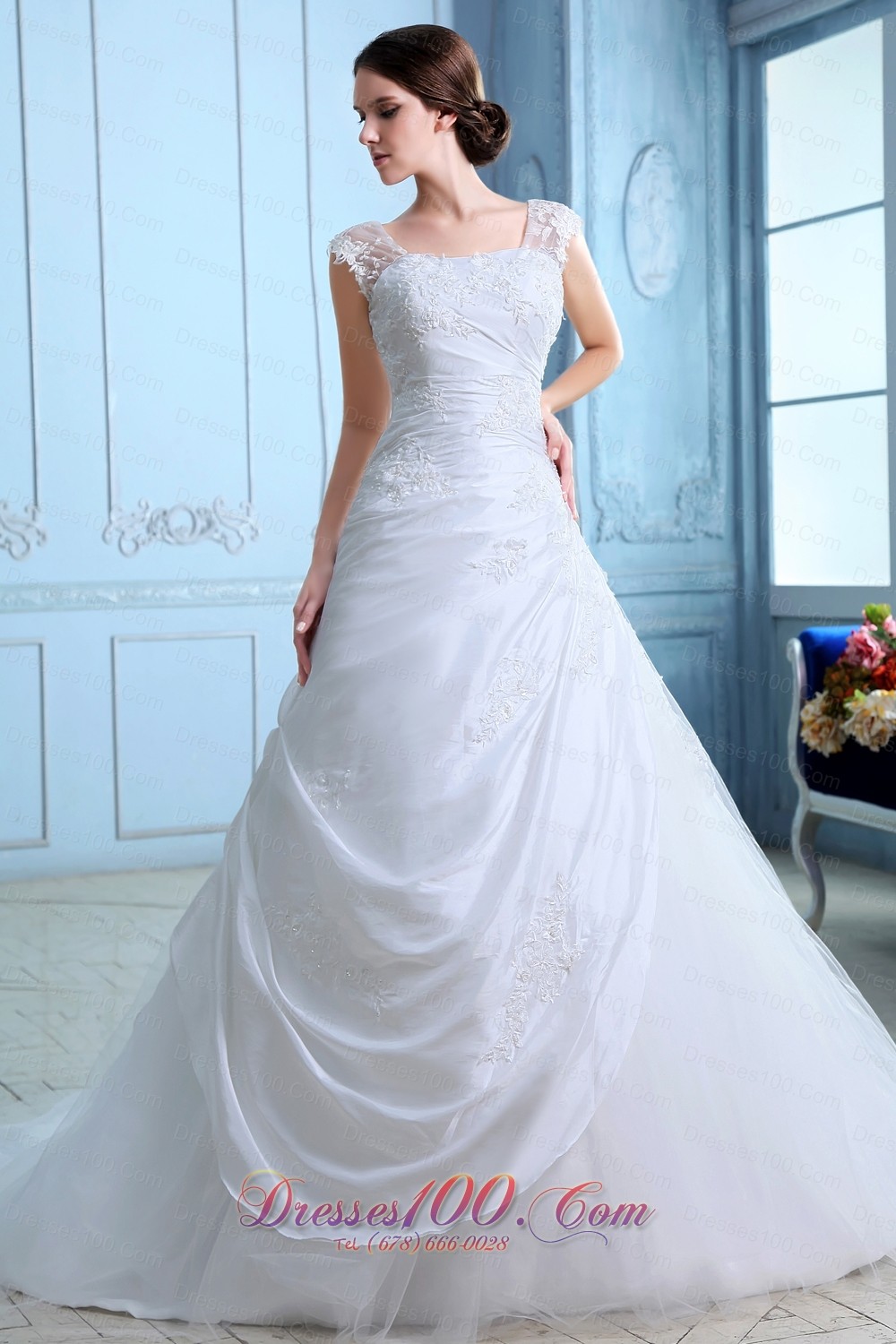 Romantic style dresses have a certain charm that never goes out of style! This one is the right one you are looking for! The gown features a wide strap bedecked by a by lace like appliques bodice. The waist is flattered so slim by exquisite ruching and shining appliques. The skirt falls with striking ruffles at the bottom of the silhouette before extending into a gorgeous train in the back. Beautiful buttons completes the back wonderfully.