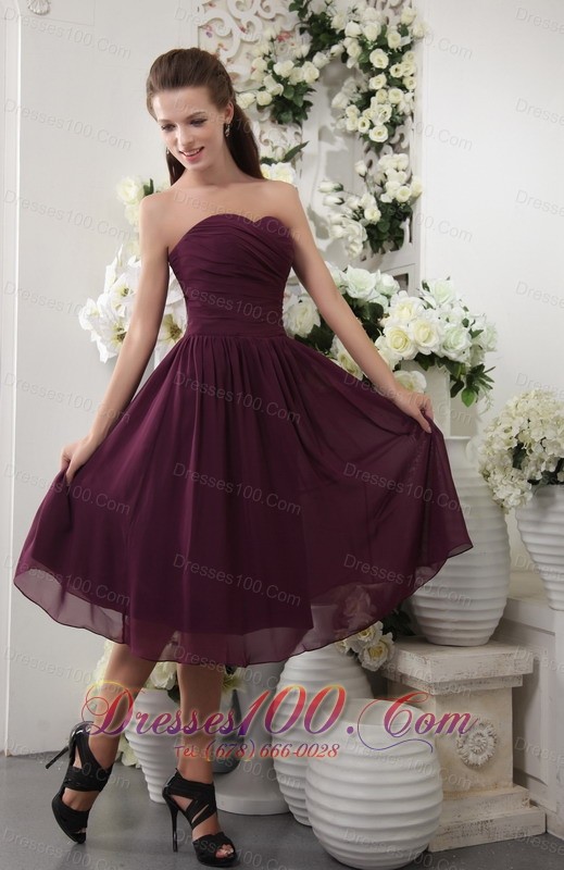 Grape Tea-length Pleat Bridesmaid Dress Empire Sweetheart
