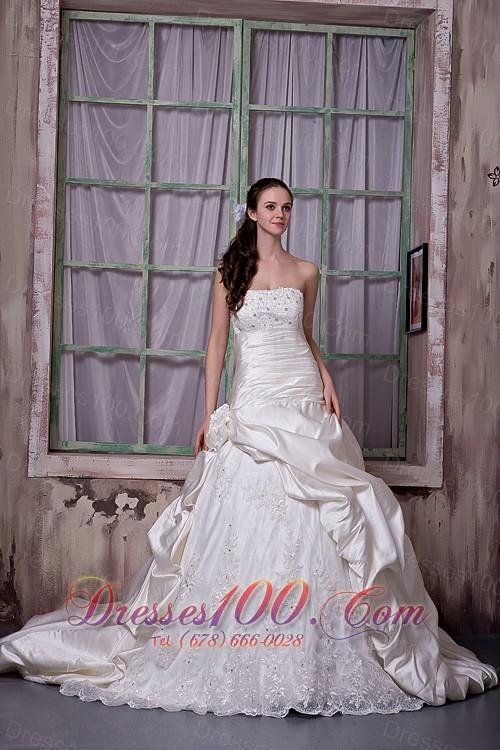 Taffeta And Lace Strapless Wedding Bridal Gown Chapel Train