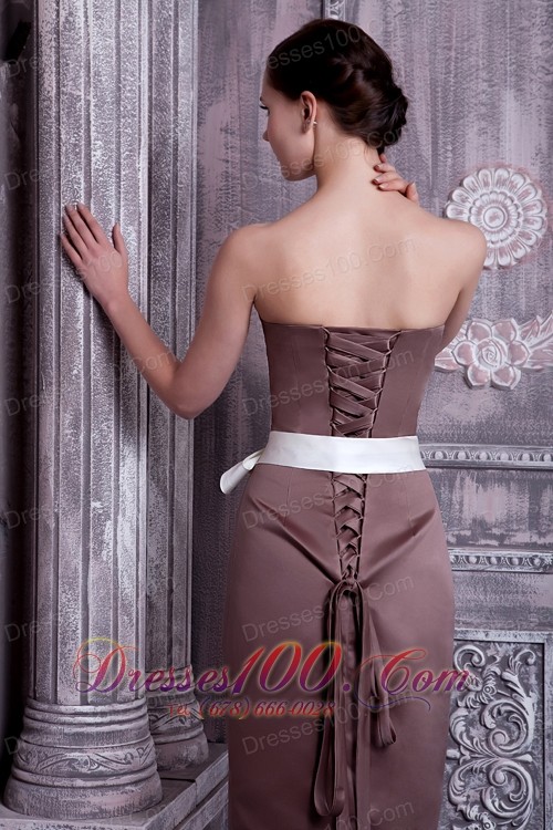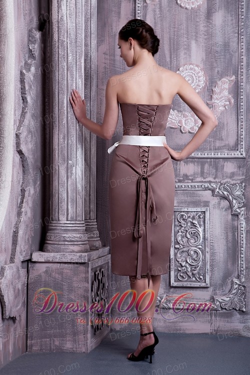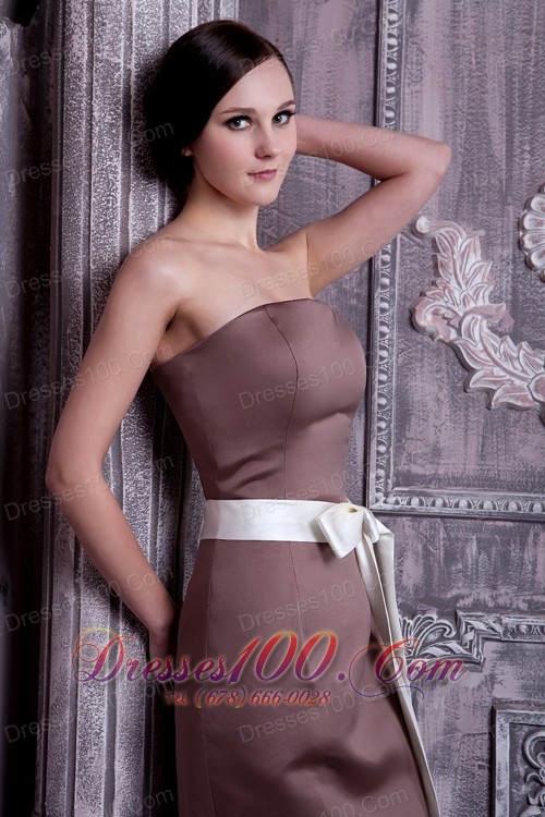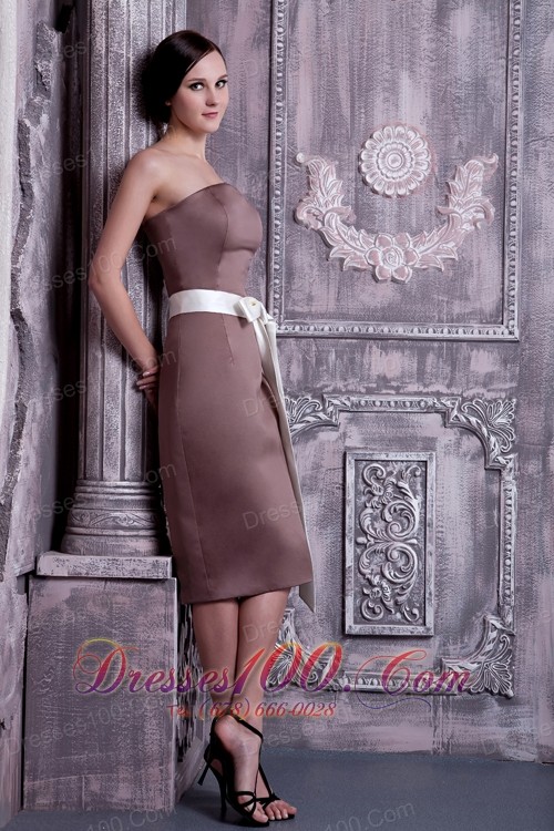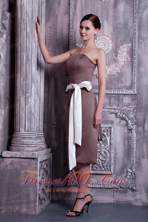 Brown Tea-length Sash Bridesmaid Dress Strapless