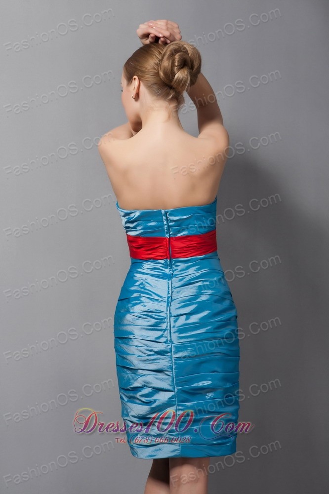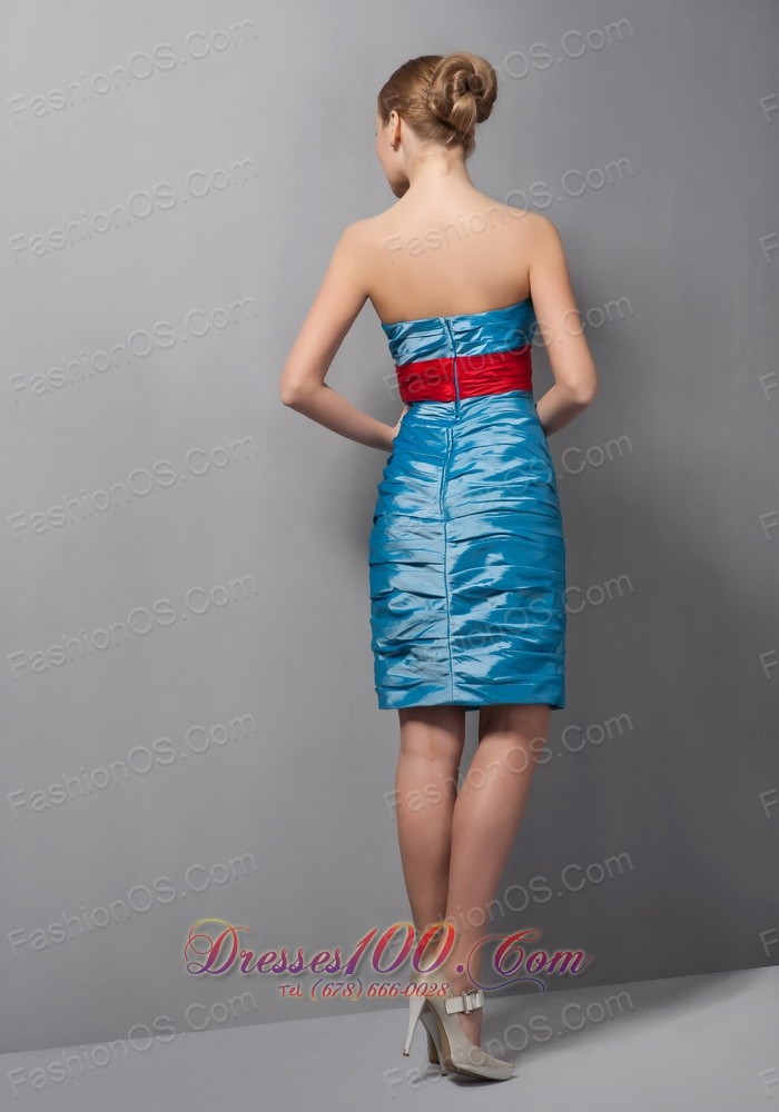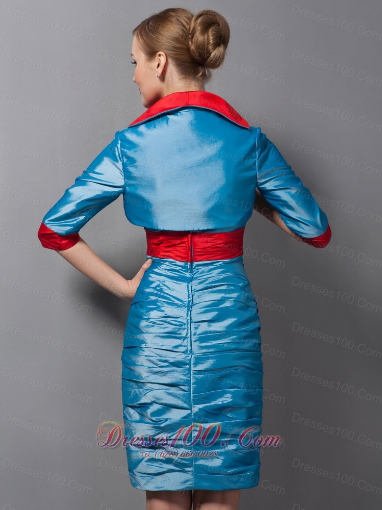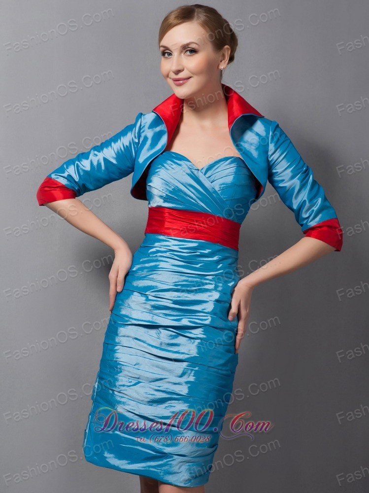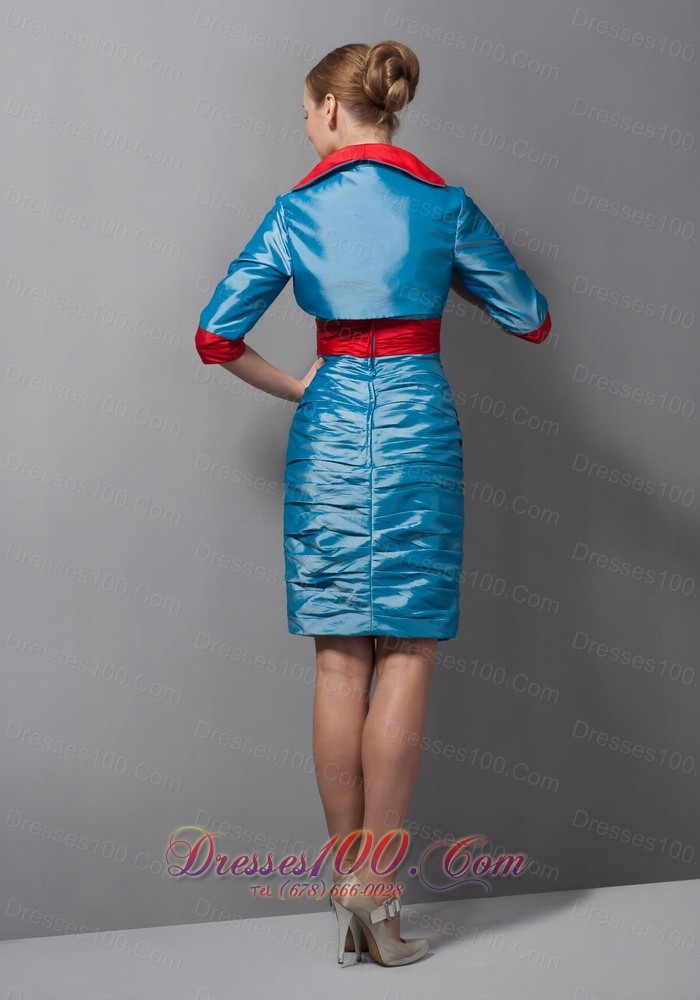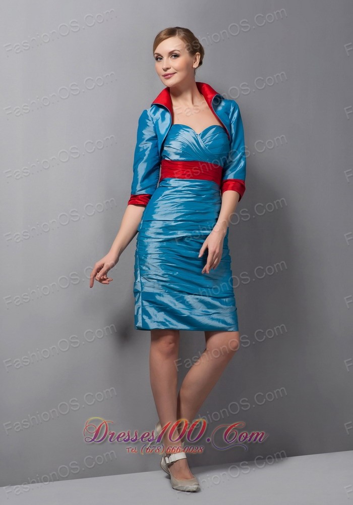 Unique and fashionable! This fantastic dress is outstanding for the whole ruched details and contrasting colors of red and blue. The red color of the broad waistband and the inner fabric of the matching jacket highlight the whole looking and add the dress a temperament of sophistication and modesty. The ruched bodice has a sweetheart neckline which shows off enough skin to reveal sexy appeal. The knee-length skirt is also ruched to complete the whole looking. The hidden zipper on the back allows easy off and on and secures the dress in place.