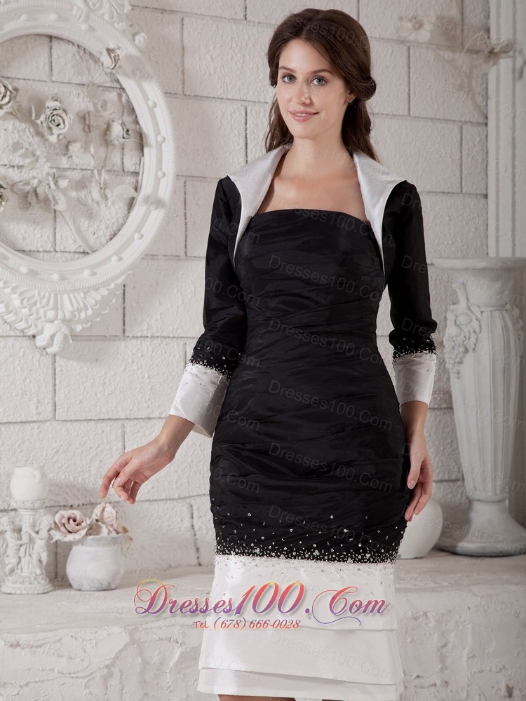 The black and white hue collection is permenant classic! It features a gorgeous straightline neckline that's sure to make the most of your figure. The sneath style flatters your perfect figure. The white layered part forms the hemline abounded with shining beading, and everything's topped off by a matching, long-sleeved bolero. The zipper up style back completes the look.