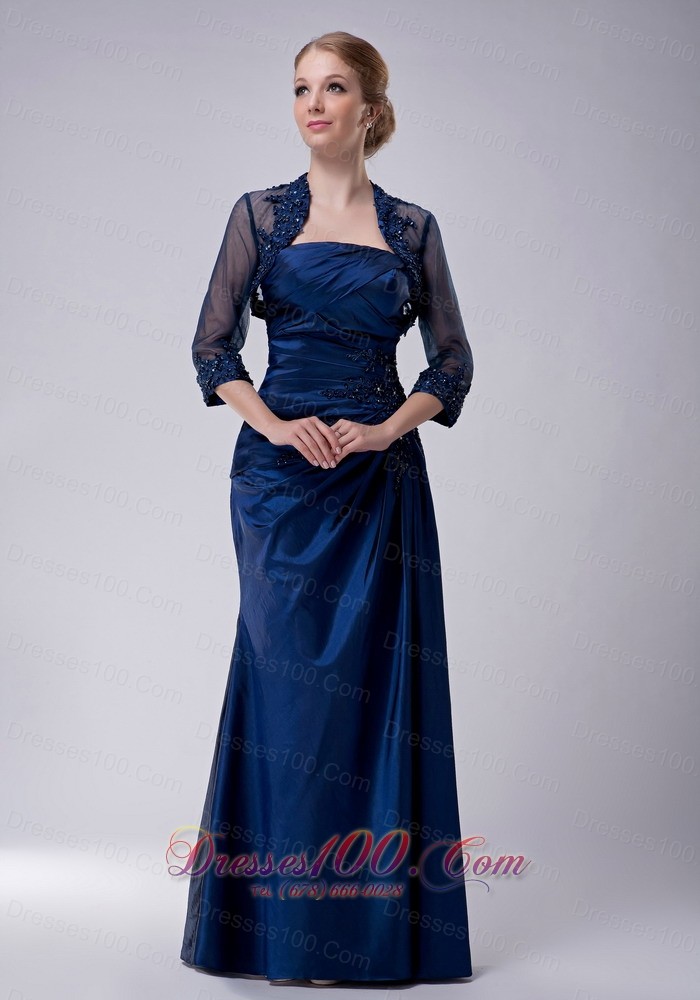 This navy blue evening gown will never be outdated for its delicate design and modesty style. It features a lovely strapless bodice embellished with delicate embroidery. The beautiful bodice is made of ruched fabric and completed with zipper up back. The floor-length skirt is slightly gathered, creating soft, clean lines that pool in a dramatic puddle at your feet. Such a wonderful gown also has a matching jacket.