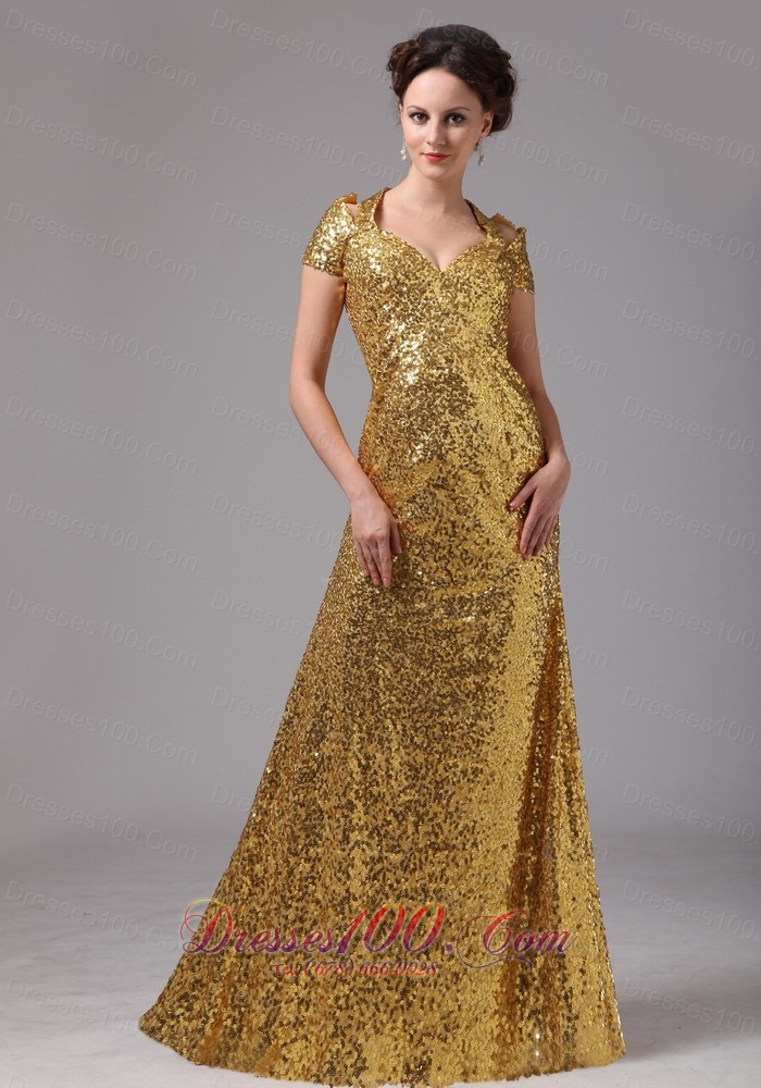 Gold Paillette Over Skirt Cap Sleeves Prom Dress