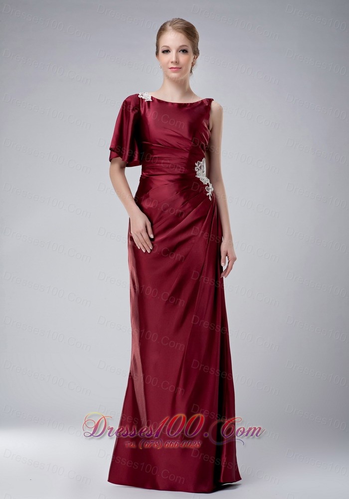 Glamour and stunning. The wine red mother of the bride dress features a scoop neckline and a amazing dresigned butterfly sleeve on the right that really make you staring. The whole skirt is highly embellished with asymmetrical ruching that gathered to teh waist with a exquisite and intricate appliques. A hidden zipper up secures the dress in place.