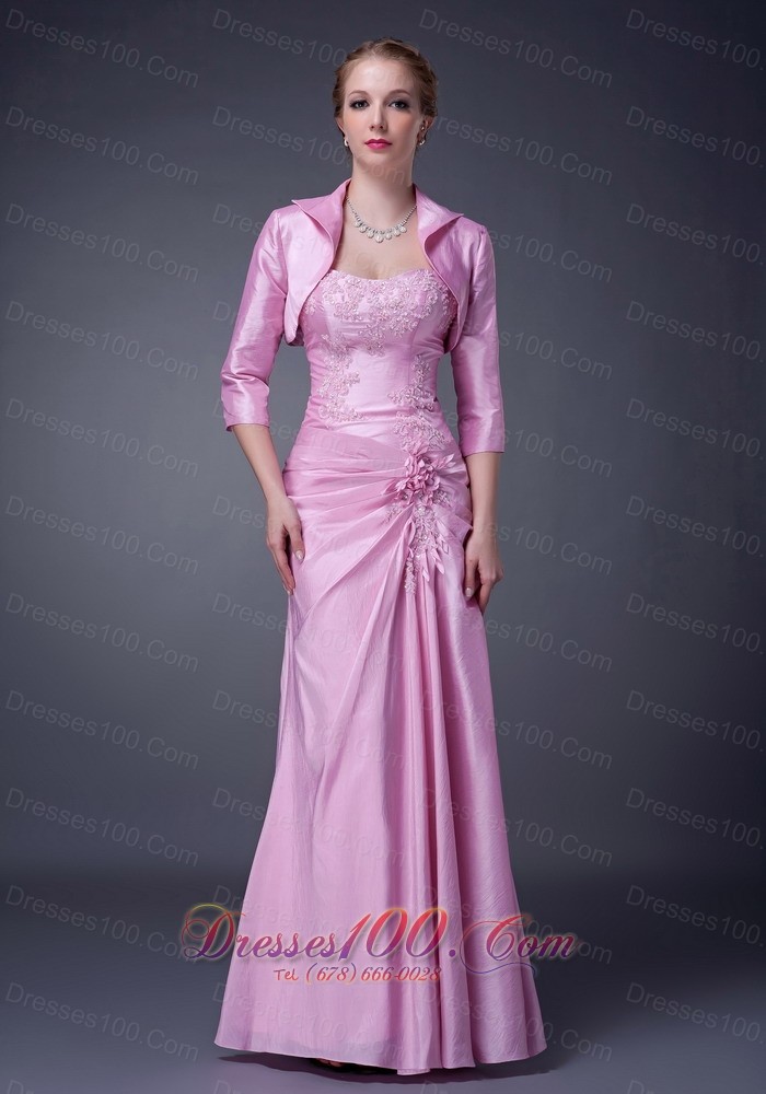 This stunning gown is ideal for a mother of the bride. The strapless bodice is glamorously appliques accent for a fashionable look. And the side of the hip is decorated with the graspings anf flowers to add the fine look. This fit and flare silhouette is flattering on women of all sizes. A chic cap sleeved bolero jacket and floral embellishments complete this charming and elegant style.