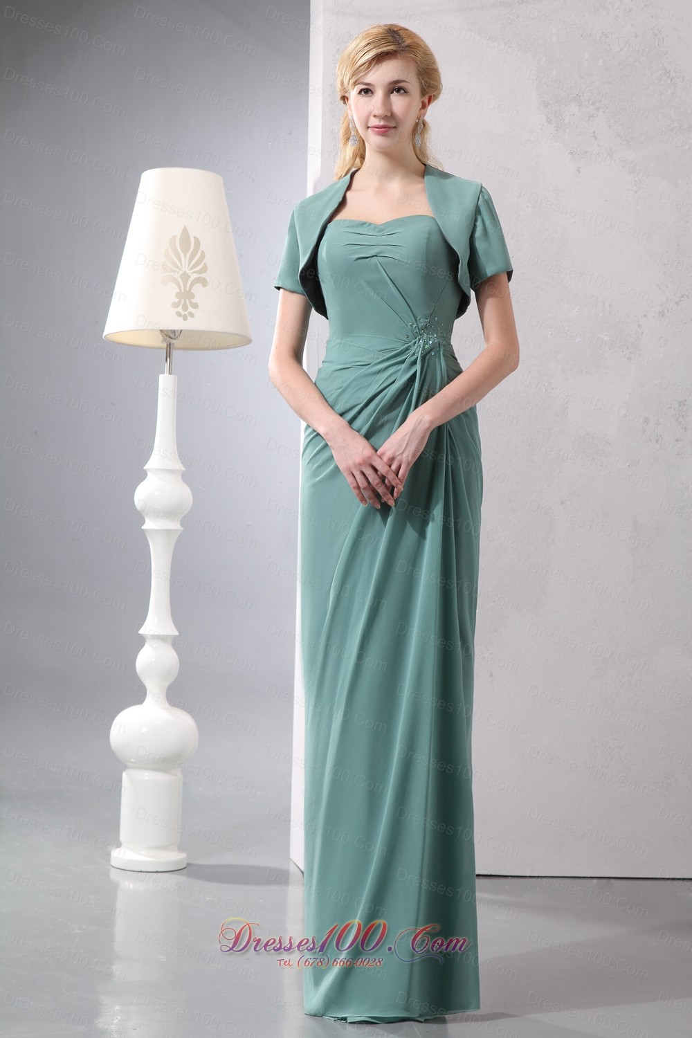 If you're looking for a chic and elegant design for your next event, look no further! It features a gorgeous sweetheart neckline that's sure to make the most of your figure. The fabric is gathered into a lovely knot with colorful beading drencehed. The straight skirt falls in soft pleats and folds, pooling at your feet. The matching jacket gives you a addtional surprise. This is an absolutely stunning design for anyone for any occasion.