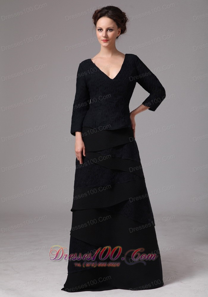 Black V-neck Layers Mother Dress 3/4 Length Sleeves