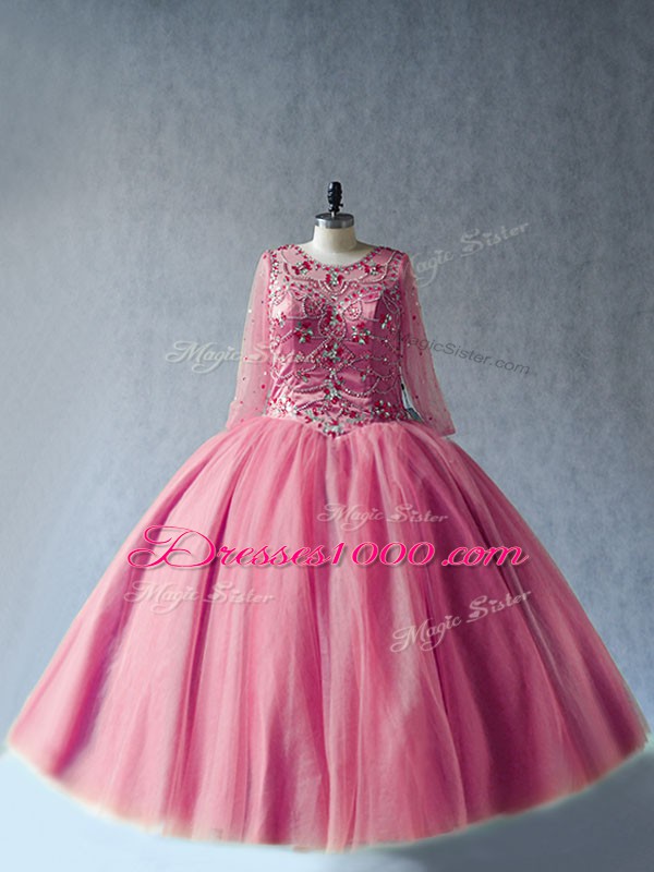 Cute Pink Lace Up Scoop Beading Sweet 16 Dresses Tulle Long Sleeves