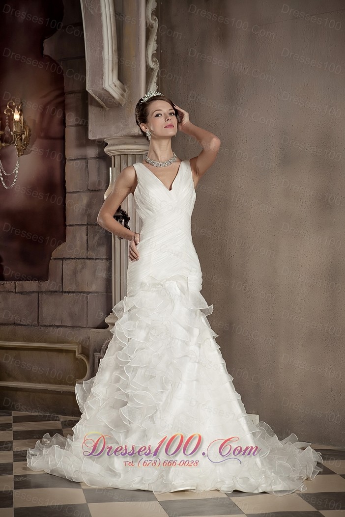 V-neck Mermaid Wedding Gown Ruffles Organza Chapel Train