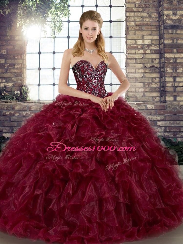 Sweetheart Sleeveless Lace Up Vestidos de Quinceanera Burgundy Organza
