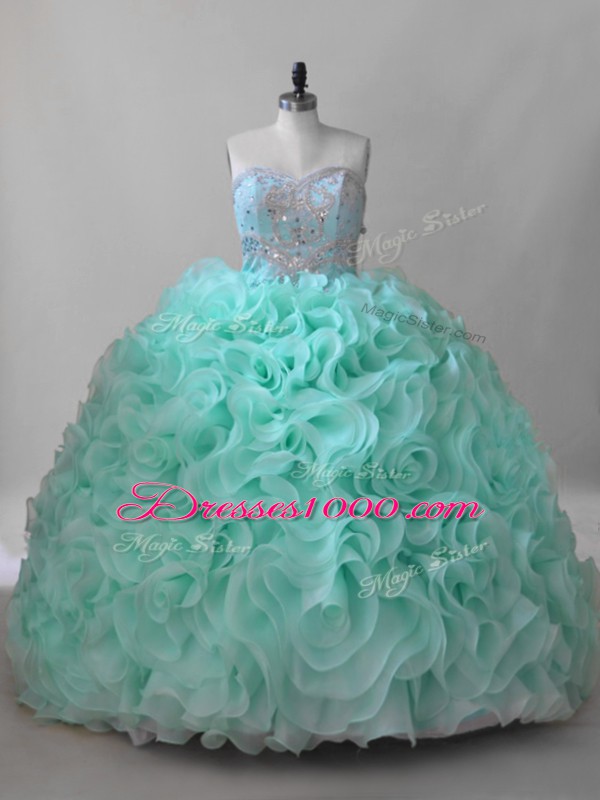 Apple Green Sleeveless Fabric With Rolling Flowers Brush Train Lace Up Sweet 16 Dress for Sweet 16 and Quinceanera