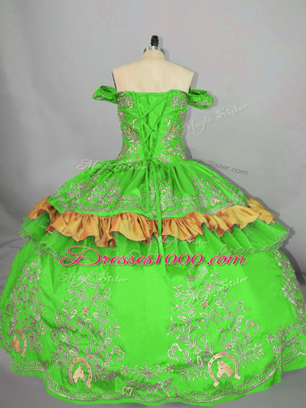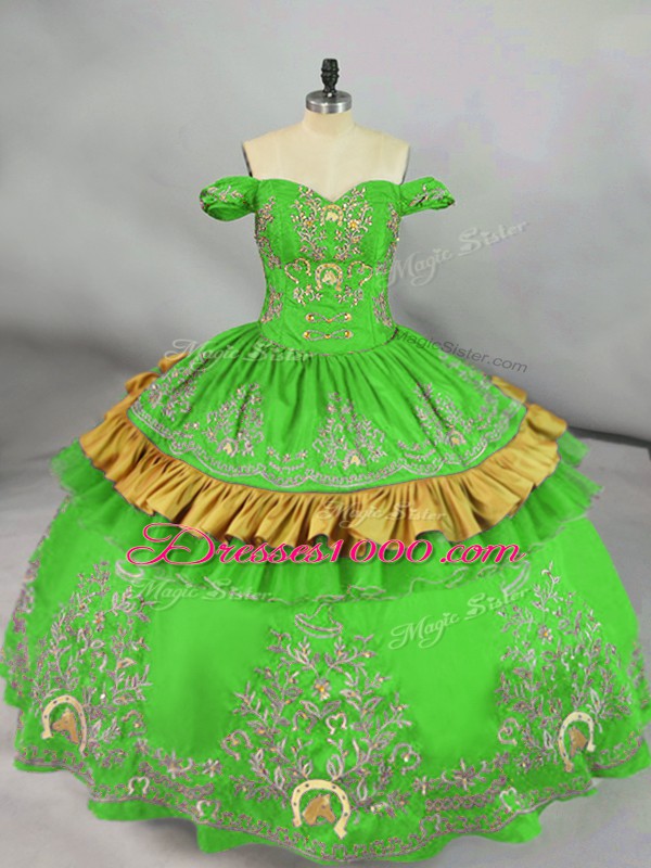 Fashionable Green Satin Lace Up Off The Shoulder Sleeveless Floor Length Quinceanera Dress Embroidery