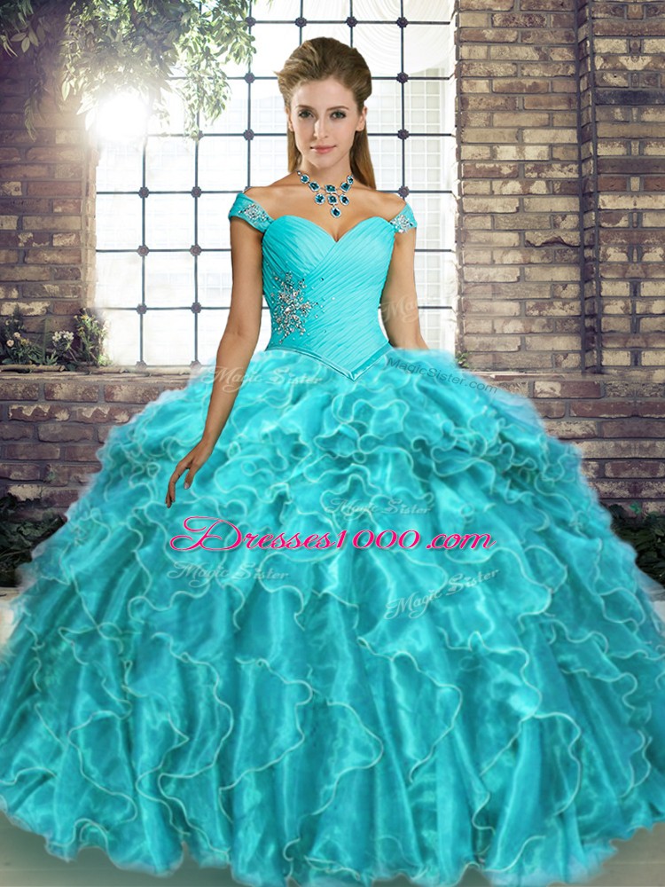 Perfect Aqua Blue Lace Up Off The Shoulder Beading and Ruffles Quince Ball Gowns Organza Sleeveless Brush Train