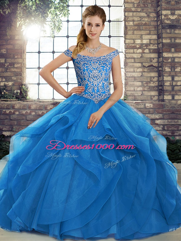 Sleeveless Brush Train Beading and Ruffles Lace Up 15 Quinceanera Dress